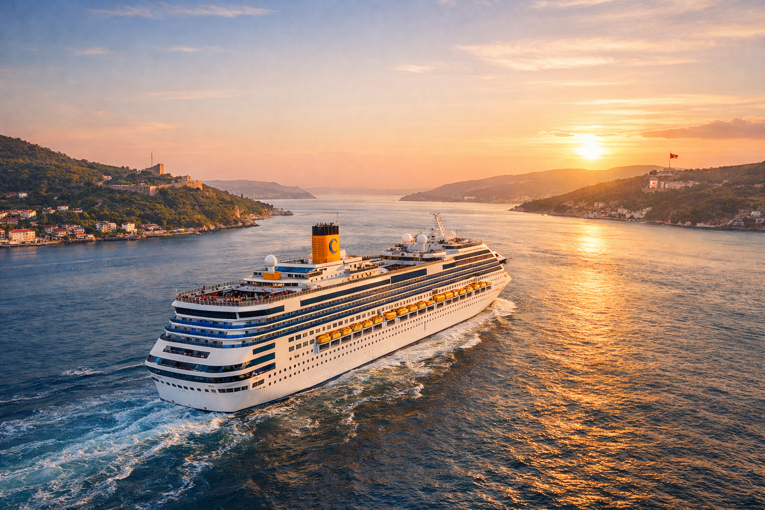 День 9: 15.08.2026 вільний день у морі, прохід через протоку Дарданели. Сніданок на круїзному лайнері.